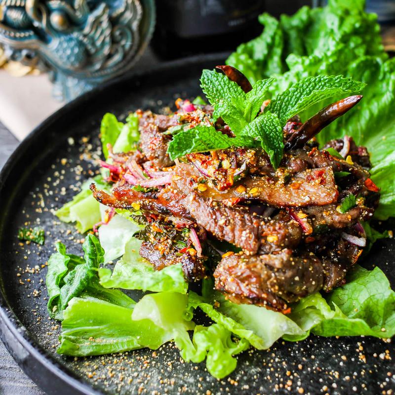 Spicy Ribeye salad, red onion, cilantro, scallions, roasted jasmine rice & Chili powder, fresh lime juice