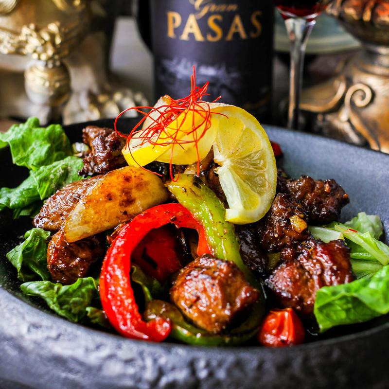 Vietnamese style shaking marinated cubes steak, bells, onion, grape tomatoes, rice
