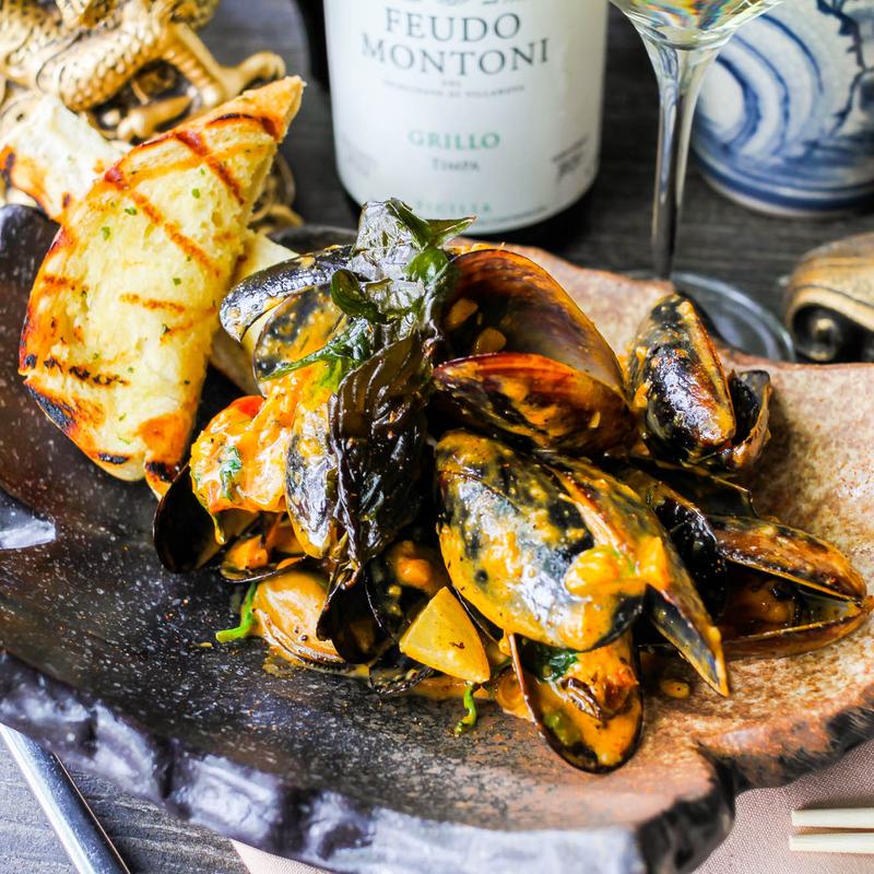 Ruby mussels w/ white wine basil Cajun cream sauce, bread