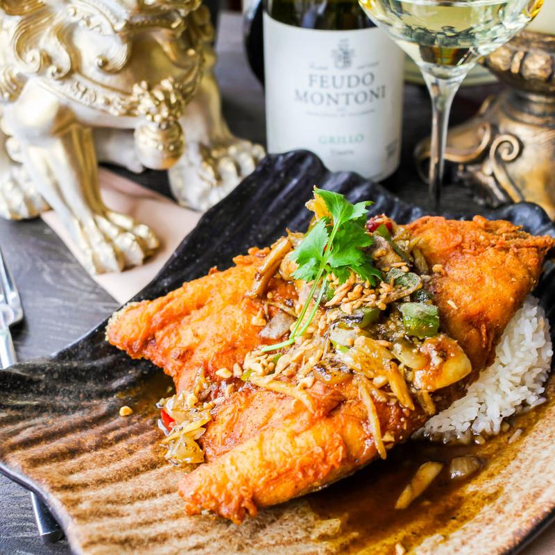 Branzino lightly fried in house special ginger sauce, mushroom, onion, bells