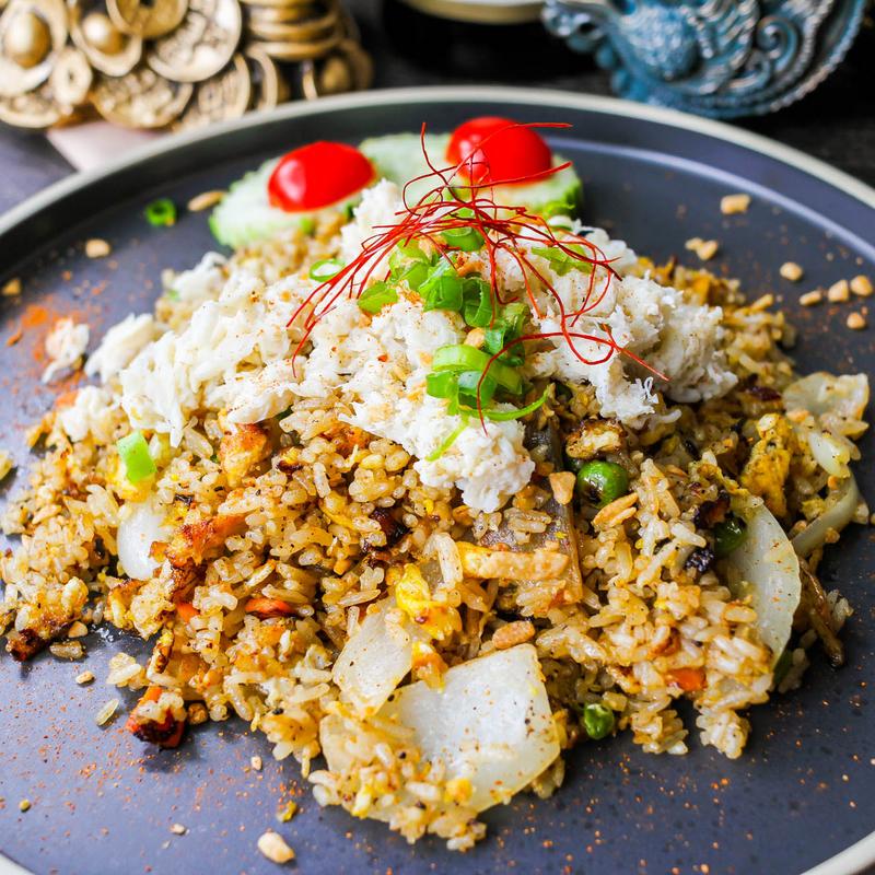 Thai-style fried rice featuring premium crab meat, eggs, peas, carrots, onions, and scallions